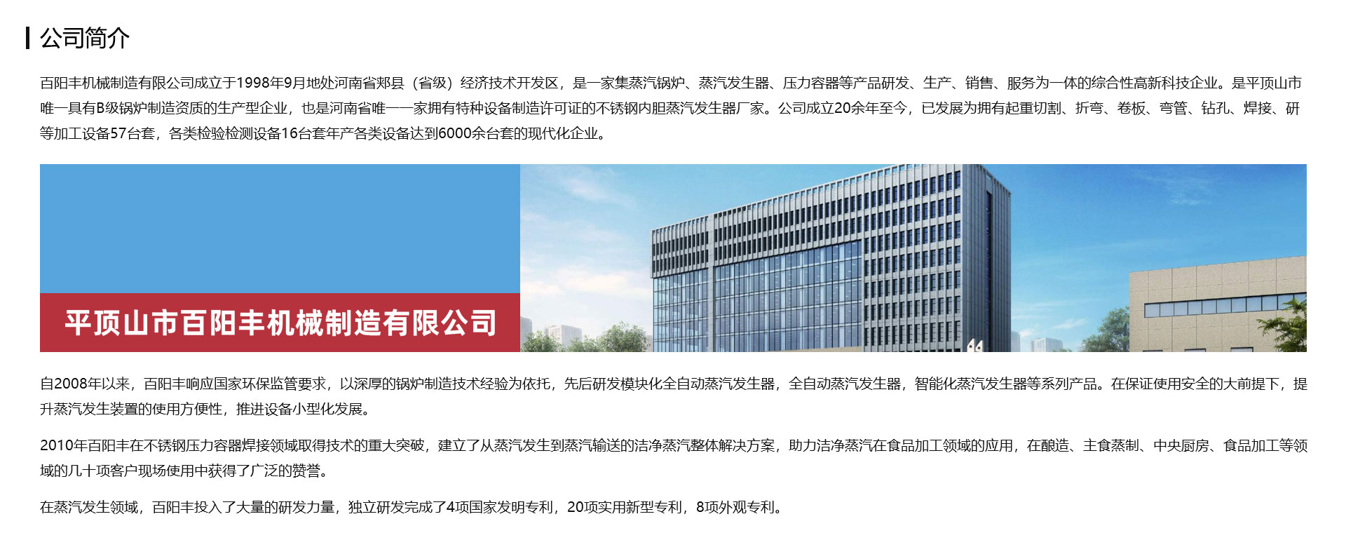 百陽豐機械制造有限公司成立于1998年9月地處河南省郟縣(省級)經(jīng)濟技術(shù)開發(fā)區(qū),是一家集蒸汽鍋爐、蒸汽發(fā)生器、壓力容器等產(chǎn)品研發(fā)、生產(chǎn)、銷售、服務(wù)為一體的綜合性高新科技企業(yè)。是平頂山市一家具有B級鍋爐制造資質(zhì)的生產(chǎn)型企業(yè),也是一家擁有特種設(shè)備制造許可證的不銹鋼內(nèi)膽蒸汽發(fā)生器廠家。公司成立20余年至今,已發(fā)展為擁有起重切割、折彎、卷板、彎管、鉆孔、焊接、研等加工設(shè)備57臺套,各類檢驗檢測設(shè)備16臺套年產(chǎn)各類設(shè)備達(dá)到6000余臺套的現(xiàn)代化企業(yè)。